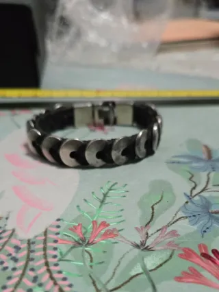 Pulsera plata de ley cuero trenzado remates y cierre plata 15 euros Pulsera de cuero con chapa redonda Cierre y remates de plata 16 euros Pulsera de eslabones redondos macizos de plata y piedra central 25 euros