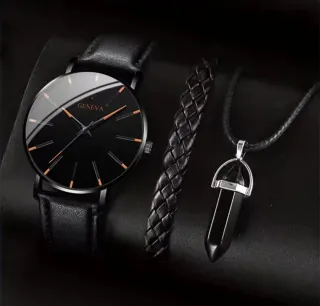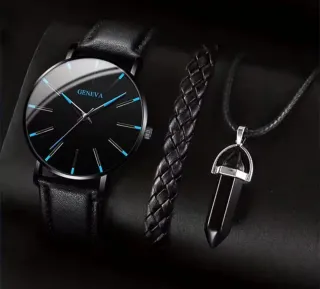 Este set incluye un reloj Geneva de diseño elegante, una pulsera trenzada y un collar con colgante. - Reloj con correa de cuero. - Pulsera de cuero trenzado. - Collar con colgante de piedra.