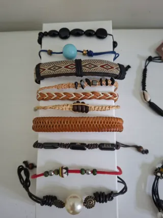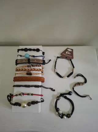 Conjunto de doce pulseras con un diseño único y variado. Todo el lote a 3 eur - Pulseras de cuero y cuentas. - Diseños trenzados y con abalorios. - Estilo artesanal y moderno.