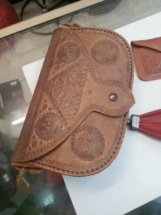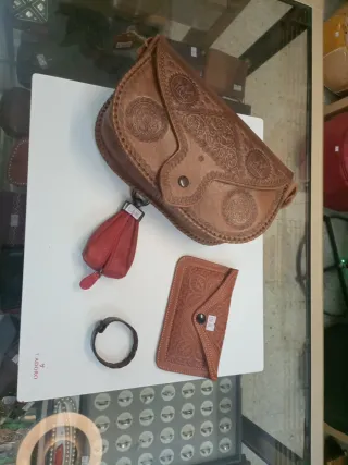 Conjunto de accesorios de cuero artesanal. - Bolso con detalles grabados. - Monedero con cierre de cremallera. - Pulsera de cuero trenzado.