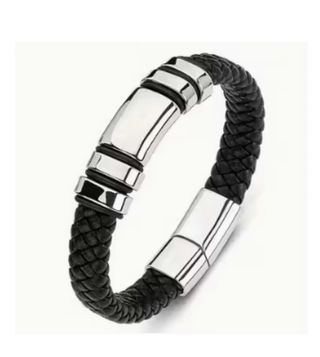 Pulsera de cuero con detalles metálicos y cierre de seguridad. - Diseño de cuero trenzado. - Elementos decorativos de acero inoxidable. - Cierre de clip resistente.