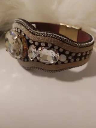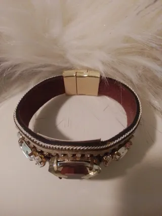 Pulsera de cuero auténtico con cuarzos naturales reales engarzados. Diseño elaborado, con varias capas y acabado de alta calidad. No pierde brillo ni color Materiales resistentes (probada con el paso del tiempo) Cierre magnético firme y cómodo Pieza especial, no bisutería común Ideal tanto para uso diario como para ocasiones especiales Estado: nuevo / excelente, sin signos de desgaste relevantes.