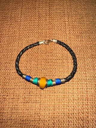 Pulsera con un diseño trenzado y adornada con cuentas de colores. - Material de la pulsera: cuero trenzado. - Cuentas decorativas: azules, verdes y una central amarilla. - Cierre de mosquetón plateado.