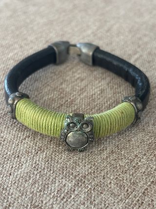 Pulsera con un diseño único y llamativo. - Base de cuero negro. - Detalle central con dije de búho. - Sección decorada con cuerda verde enrollada. - Cierre metálico.