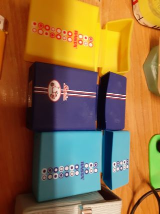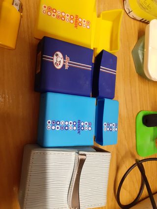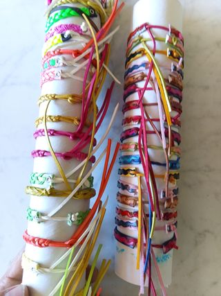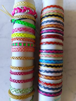 Tubos con 44 pulseras de colores. Las del tubo pequeño son de cuero y algunas del otro también.