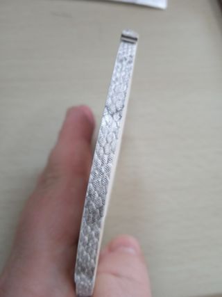 Elegante reloj de pulsera con funda protectora. - Diseño clásico con esfera plateada. - Funda de cuero sintético negro. - Cierre a presión en la funda.