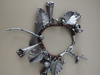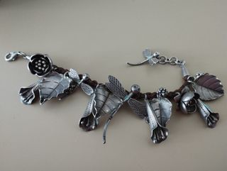 Pulsera de cuero con piezas colgadas de plata inspiradas en la naturaleza.