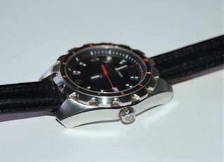 Reloj de pulsera con diseño elegante y correa de cuero. - Caja de acero inoxidable. - Correa de cuero genuino. - Resistencia al agua de 300 metros. - Fabricado en Suiza.