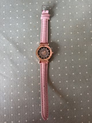 Elegante reloj de pulsera con un diseño delicado. - Correa de cuero rosa. - Esfera con detalle floral. - Bisel y manecillas en tono dorado. SE HACEN ENVÍOS O ENTREGA EN MANO EN BADALONA, SABADELL, CASTELLAR DEL VALLÉS O BIGUES