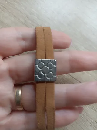 Pulsera de cuero con detalle metálico. - Diseño de doble tira. - Cierre magnético. - Adorno central con diseño floral.