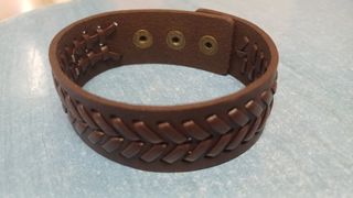 Pulsera de cuero con un diseño tejido en tono marrón y cierre de material Zamak. Medida ancho 13 mm. Medida largo 21 cms. Nueva. Nunca usada.