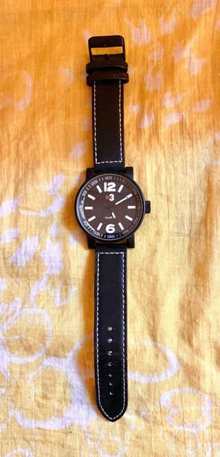 Reloj de pulsera con correa negra de Televisió de Catalunya. - Esfera redonda. - Correa de cuero con pespuntes blancos. - Hebilla metálica. Medidas: esfera: 4,5 cm largo: 24 cm
