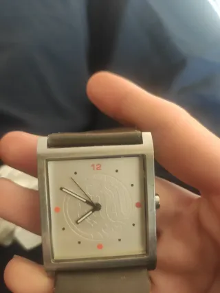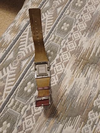 HAY QUE PONERLE PILAS!!! La marca no sé seguro cuál es Reloj vintage de pulsera con diseño único. - Correa de cuero con textura. - Caja plateada. - Esfera con detalles distintivos.