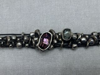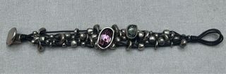 Elegante pulsera con diseño de cuero negro y detalles en zamak plateado. Cierre de imán. Múltiples tiras de cuero. Adornos metálicos y elmento central metálico ovalado. Medida largo 19 cms. Nueva. Nunca usada.