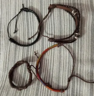 Conjunto de cuatro pulseras de estilo bohemio y casual. - Pulsera negra trenzada. - Pulsera de cuero marrón con detalles metálicos. - Pulsera multicolor de hilo. - Pulsera marrón de nudos.