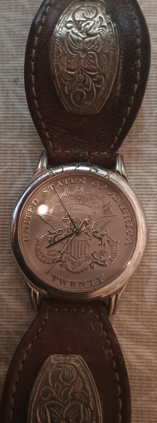 Reloj de pulsera con un diseño único que incorpora una moneda de plata. REBAJAS DE ENERO - Correa de cuero marrón. - Detalles plateados en la correa y hebilla. - Esfera con diseño de águila y texto UNITED STATES OF AMERICA TWENTY.