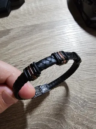 Pulsera de cuero negra en material zamak. Con diseño de trébol. Cierre magnético. En buen estado. Nueva, pero con algún pequeño desgaste. La pulsera hace de largo 21 cm