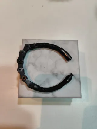 Pulsera con diseño inspirado en una cadena de bicicleta. - Elaborada con eslabones de cadena. - Acabado en cuero trenzado. - Sin uso ciclismo cycling bracelet bike chain