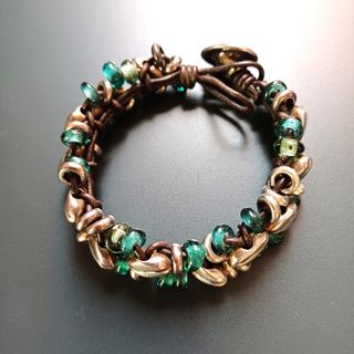 Pulsera original UNOde50, en perfecto estado. Diseño artesanal con cuentas de cristal verde, combinadas con piezas metálicas plateadas características de la marca y cordón de cuero. El cristal aporta un acabado orgánico y elegante, en la línea creativa de UNOde50. Cierre mediante lazada de cuero, cómodo y seguro. Las medidas se muestran claramente en las fotografías para una correcta valoración del tamaño antes de la compra. Se entrega con 1 bolsa original de la marca