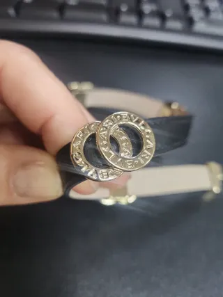 Elegante pulsera Bvlgari de doble vuelta. - Diseño en cuero negro. - Detalles metálicos dorados con el logo de la marca. - Cierre seguro.