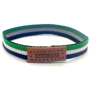 Pulsera elástica con detalle de cuero, inspirada en Extremadura. - Diseño de rayas en azul, blanco y verde. - Etiqueta de cuero con el nombre 'EXTREMADURA'. Pulsera de lona elástica con la bandera de Extremadura. Pieza de cuero marrón con grabado Extremadura. Ancho 1cm