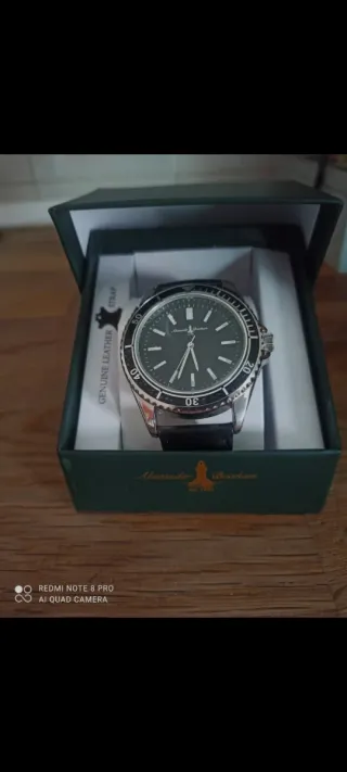 Elegante reloj de pulsera de la marca Alexander Brixham. Presenta una esfera oscura y una correa de cuero. - Caja de cuero. - Correa de cuero genuino. - Bisel giratorio.
