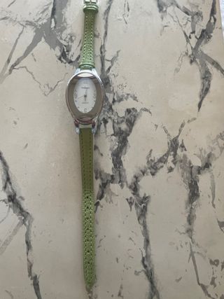 Elegante reloj de pulsera con un diseño ovalado. - Correa de cuero verde. - Detalles plateados en la caja. - Esfera blanca con números.