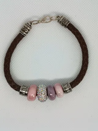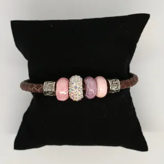 Bonita pulsera de cuero trenzado con varios abalorios decorativos. - Pulsera de cuero marrón. - Abalorios de diferentes colores y texturas, incluyendo uno con pedrería. - Cierre de metal plateado.