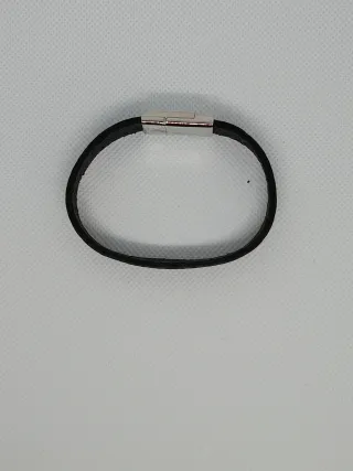 Pulsera con diseño moderno y cierre de seguridad. Medidas aproximadamente 15 cms, de diámetro 6/6,5 cms. Ideal para niñas o adolescentes con muñeca finita. - Diseño de plata y cuero. - Cierre magnético plateado.