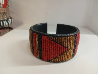 Pulsera Masai elaborada a mano con cuentas. - Diseño tribal con detalles en rojo, negro y dorado. - Montura interior de cuero negro.