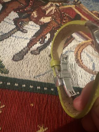 Reloj de pulsera con correa de cuero verde y detalles plateados. - Esfera de color verde. - Correa de cuero. - Bisel plateado.