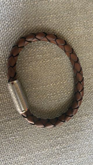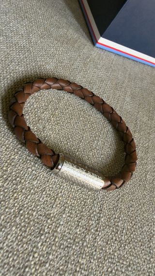 Pulsera de cuero trenzado con cierre metálico. - Diseño trenzado en cuero. - Cierre cilíndrico plateado con grabado.