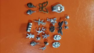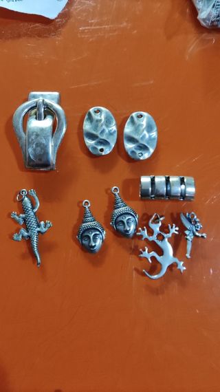 Lote para realizar bisuteria las piezas están realizadas en Zamak, aleación de metales que no se ponen feos. Está compuesto de cierre de pulsera magnético tipo hebilla, colgantes varios y piezas para pulseras de cuero. Restos de tienda.