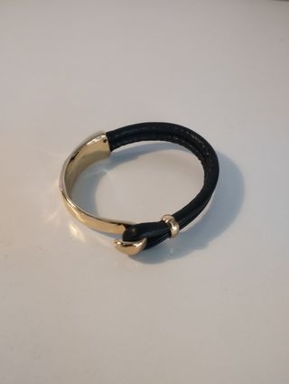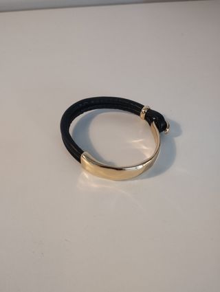 Elegante pulsera de cuero con detalles dorados. - Diseño artesanal. - Combinación de cuero negro y adornos dorados.