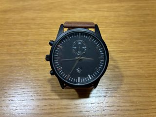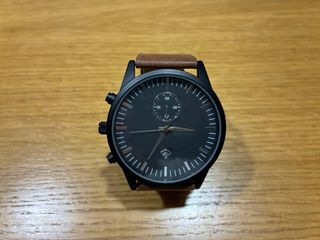 Reloj de pulsera con correa de cuero. - Esfera redonda negra. - Correa de cuero marrón. - Cierre de hebilla.