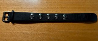 Pulsera de cuero con un diseño llamativo. - Tres adornos de calaveras doradas. - Cierre de botón .18,5 de larho y 5 de diametro