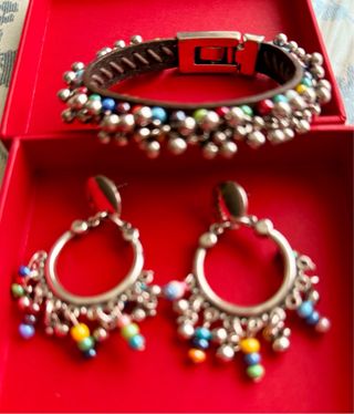 Conjunto de pulsera y pendientes de la marca Ciclón. - Pulsera con base de cuero y adornos de cuentas. - Pendientes a juego con cuentas de colores.