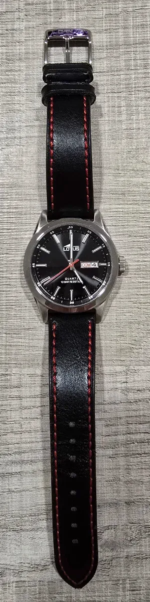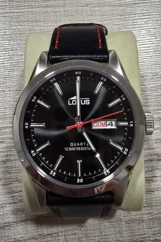 Reloj de pulsera LOTUS para hombre con detalles en rojo. - Esfera negra. - Correa de cuero negra con pespuntes rojos. - Bisel plateado. - Indicador de día y fecha.