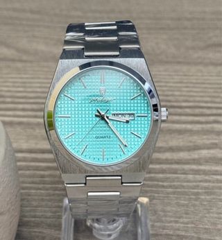 Elegante reloj de pulsera con un diseño clásico y esfera texturizada. - Caja y brazalete de acero inoxidable plateado. - Esfera de color turquesa. - Indicador de día y fecha.