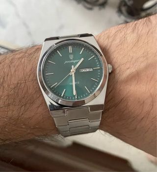 Elegante reloj de pulsera con una esfera verde vibrante y detalles plateados. - Diseño moderno y sofisticado. - Correa de acero inoxidable plateado. - Indicador de día y fecha.