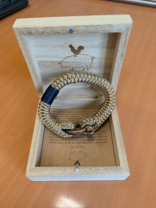 23 cm de longitud. Precio nueva 56 € Pulsera Pig And Hen para hombre. Pulsera plana trenzada fabricada en cuerda naútica de nylon, en colores beiges. Una pulsera con una medida de 11 milímetros de alto. Para hombres de éxito, que han llegado alto y recorren el mundo con su propio estilo. Las pulseras Pig And Hen están hechas a mano en su ciudad natal: Ámsterdam.