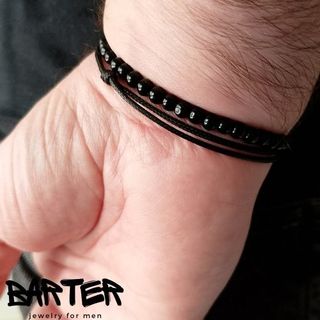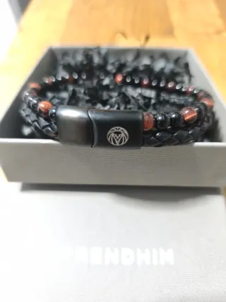 Conjunto de pulseras de la marca Barter, modelo T-342, para hombre. - Diseño con cuentas negras, de 4 mm de grosor y 19 de largo. Piedra natural, mate. - Tejido negro con motivos blancos y rojos, plano, de 4 mm de ancho. Algodón. - Cordón de algodón en negro y rojo, ajustable. - Tallaje: L/XL. Perfecto para regalo. Resto de tienda nuevo con etiquetas y embalaje original de la marca. Descuento por lotes. Envío con GLS, SEUR, UPS y Correos. Inpost/Mondial Relay envío los viernes.