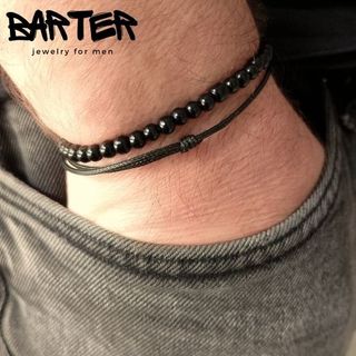 Dos pulseras elegantes para hombre de complexión delgada o para mujer, de la marca BARTER. Son de color negro y tienen un diseño sencillo y sofisticado. - Pulsera elástica de piedra pulida, símil azabache. - Cordón ultrafino de algodón encerado, ajustable. Dan poca talla XS/S. Resto de tienda en perfecto estado, con etiqueta y embalaje de la marca. Descuento por lotes. Envío con GLS y Correos.