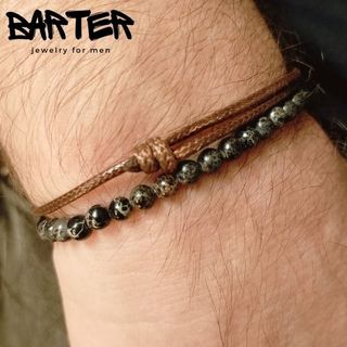 Elegante juego de dos pulseras para hombre de la marca Barter. Son de color negro y marrón, con un diseño sobrio y elegante. - Elaboradas con piedras pulidas oscuras. 4 mm. - Cordón marrón de algodón encerado ajustable. La mezcla de gris, negro y marrón resulta muy elegante. Aptas para diferentes tipos de tallas, dado que son extensibles. Resto de tienda nuevo con etiquetas y embalaje de la marca. Envío con GLS y Correos.