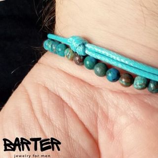 Pulseras de la marca Barter, modelo Kalambue. Es un accesorio de estilo moderno y único. Para hombre. - Diseño con cuentas de 6 mm en un espectacular azul verdoso, elástica, mide 20 cm. - Cierre ajustable de algodón satinado, de 3 mm de grosor, redondo. - Tallaje: L/XL Perfecto para regalo. Resto de tienda nuevo con etiquetas y embalaje original de la marca. Descuento por lotes. Envío con GLS y Correos.