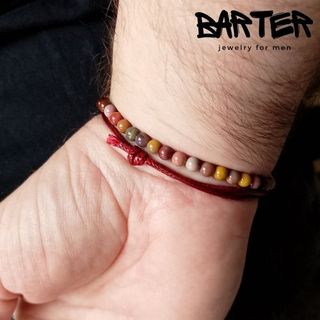Pulsera para hombre de la marca Barter, modelo Seychelles. combinación exclusiva, compuesta por: - Diseño con cuentas de piedra pulida, de 4 mm, de colores variados, marrón, gris, beige, borgoña, etc. Elástica, mide 18 cm. - Cordón resistente de algodón encerado, en un precioso color burdeos. - Bolsita de arpillera de regalo. Perfecto para regalar. Resto de tienda nuevo con etiquetas y embalaje original de la marca. Descuento por lotes. Envío con GLS y Correos.