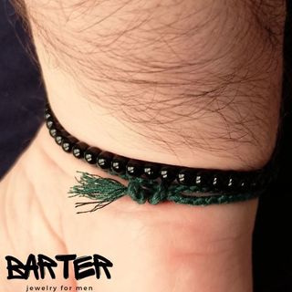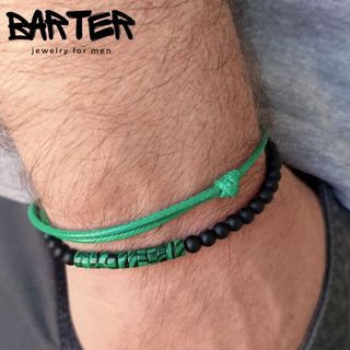 Pulsera de la marca Barter, modelo 302 Eyasi, diseñada para hombre. Cuenta con un diseño elegante y moderno. - Cuentas negras de piedra pulida, de 4 mm, con un detalle central de piedra verde. Largo 19 cm. - Cordón verde trenzado, del algodón y lino. Extensible. - Tallaje: X/XL Perfecto para regalo. Resto de tienda nuevo con etiquetas y embalaje original de la marca. Descuento por lotes. Envío con GLS y Correos. Inpost/Mondial Relay envío los viernes.