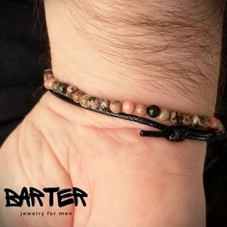 Pulsera de la marca Barter, modelo Túnez, diseñada para hombre. -Combina cuentas de piedra pulida, de 4 mm de espesor, en tonos rosados, marrones y negros. Elástica, mide 19 cm. - Cordón de algodón negro encerado, ajustable. Resto de tienda nuevo con etiquetas y embalaje original de la marca, perfecto para regalar. Hago descuento por lotes. Envío con GLS y Correos.