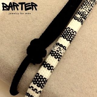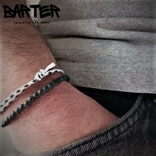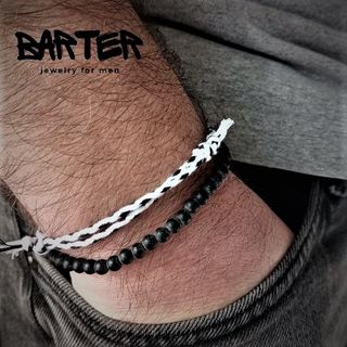Conjunto de pulseras Barter, modelo 322, para hombre. - Diseño a rayas blancas y negras. Tejido de algodón en negro y crema, plano de 4 mm de grosor, ajustable. - Cordón de algodón, negro, de 3 mm de grosor. Ajustable. - Dan hasta talla XXL. Perfecto para regalo. Resto de tienda nuevo con etiquetas y embalaje original de la marca. Descuento por lotes. Envío con GLS y Correos. Inpost/Mondial Relay envío los viernes.
