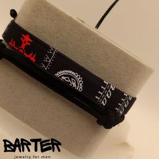 Pulseras de la marca Barter, modelo T344, pensadas especialmente para hombre. - Diseño con motivos en rojo y blanco sobre fondo negro. Tejido de algodón plano, de 1 cm de ancho. - Cuerda negra trenzada, de 3 mm de grosor. - Cierre ajustable a diferentes tipos de tallas, hasta XXXL. Perfecto para regalo. Resto de tienda nuevo con etiquetas y embalaje original de la marca. Descuento por lotes. Envío con GLS, SEUR, UPS y Correos. Inpost/Mondial Relay envío los viernes.
